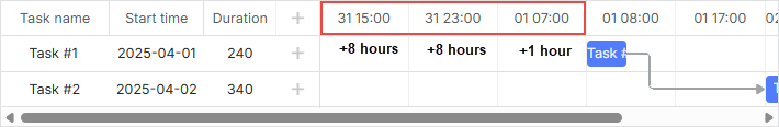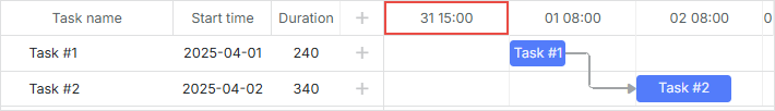 Angenommen, die früheste Aufgabe beginnt am 1. April 2025 um 08:00 Uhr. Sehen wir uns an, wie Gantt die Offsets vor dieser Aufgabe berechnet, abhängig von der Einstellung gantt.config.skip_off_time.