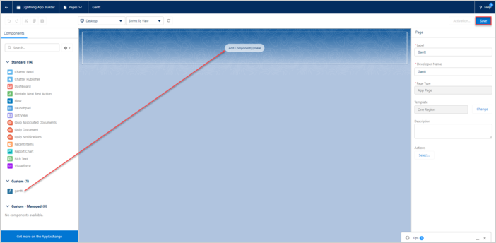 Die benutzerdefinierte Gantt-Komponente sollte nun für die neue Seite verfügbar sein. Fügen Sie sie einem beliebigen Abschnitt hinzu und speichern Sie.