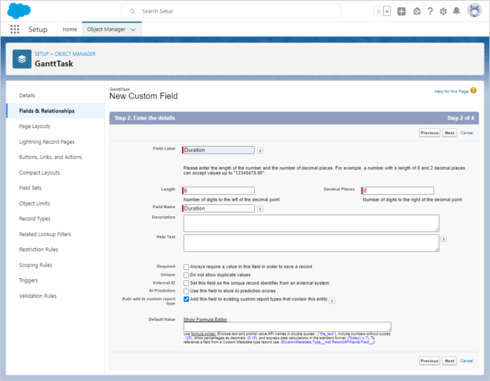 Benennen Sie das Feld "Duration". Dieses Feld speichert die als JSON serialisierten Eigenschaften der Aufgabe. Klicken Sie so oft auf "Weiter", bis die Schaltfläche "Speichern & Neu" erscheint.