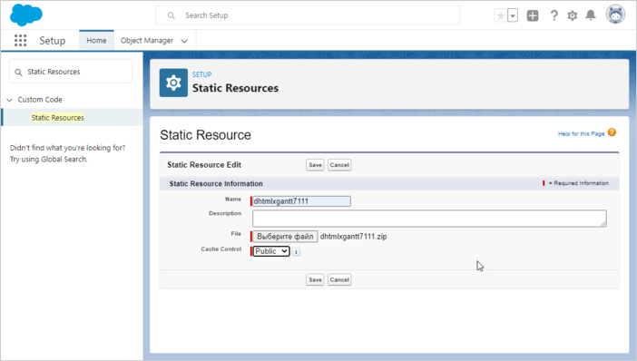 명확한 이름(예: "dhtmlxgantt7111")을 입력하고, 라이브러리 파일(dhtmlxgantt.jsdhtmlxgantt.css)이 포함된 ZIP 압축 파일을 업로드하세요. Cache Control을 "Public"으로 설정하여 성능을 향상시킵니다. 변경 사항을 저장하세요.