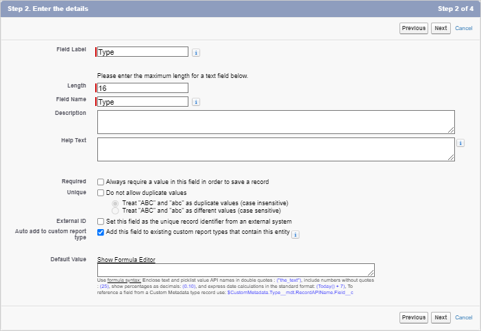 기본 설정을 그대로 두고 "Next"를 계속 클릭하여 저장 또는 새 필드 추가 화면으로 이동하세요.