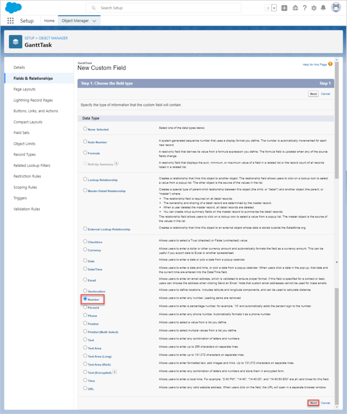 Основные компоненты dhtmlxGantt - это задачи (Tasks) и связи (Links). Практичный способ их хранения - сохранять их свойства в формате JSON в Salesforce. Начните с создания пользовательских объектов для задач и связей. Перейдите в Object Manager, затем выберите "Create" и выберите "Custom Object":