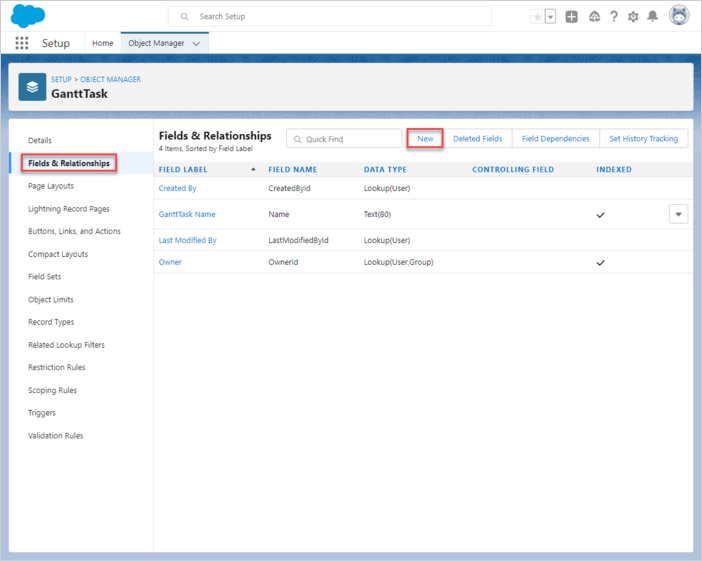 Затем откройте вкладку "Fields & Relationships" и нажмите "New" для добавления полей: