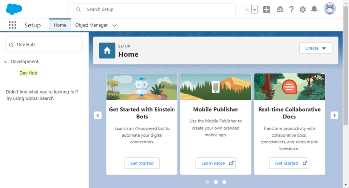 Verwenden Sie die Suchleiste auf der linken Seite, um Dev Hub zu finden und auszuwählen: