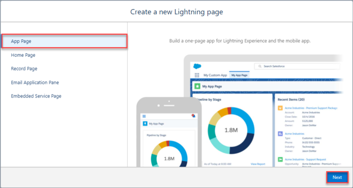 "Lightning App Builder"를 열고 새 Lightning Page를 만드세요.